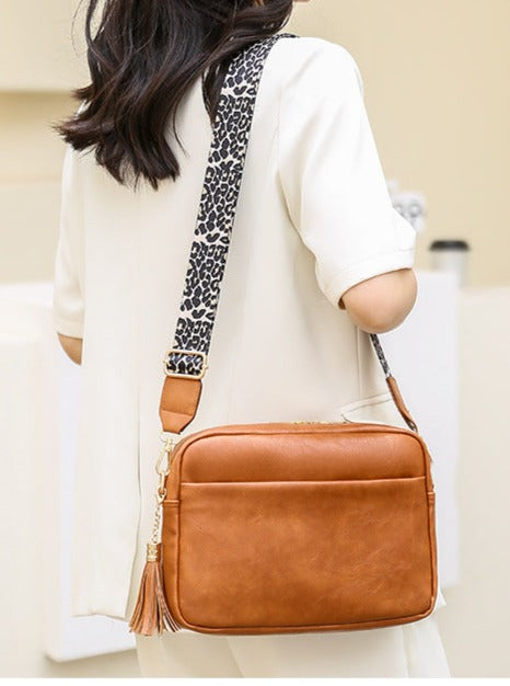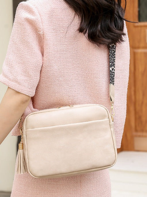 This Faux-leather crossbody bag is so soft and dreamy. Comes with a trendy and fun canvas strap and shiny gold classic hardware! Zippered Top and linen beige interior with a zippered stash pocket on the inside.